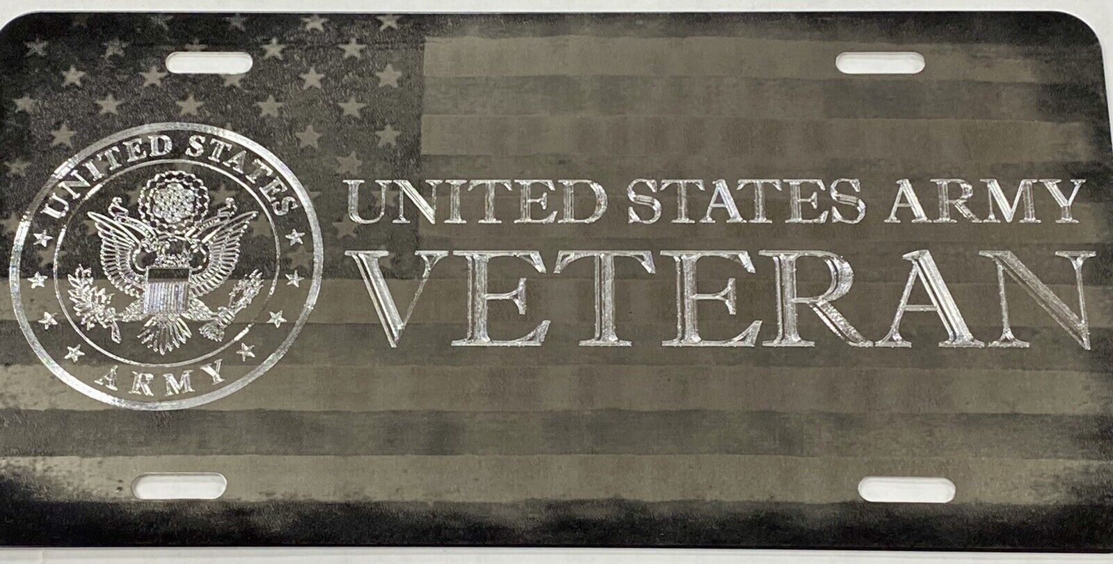 Combo Engraved US Flag Diamond Etched Army Vet Veteran Car Tag