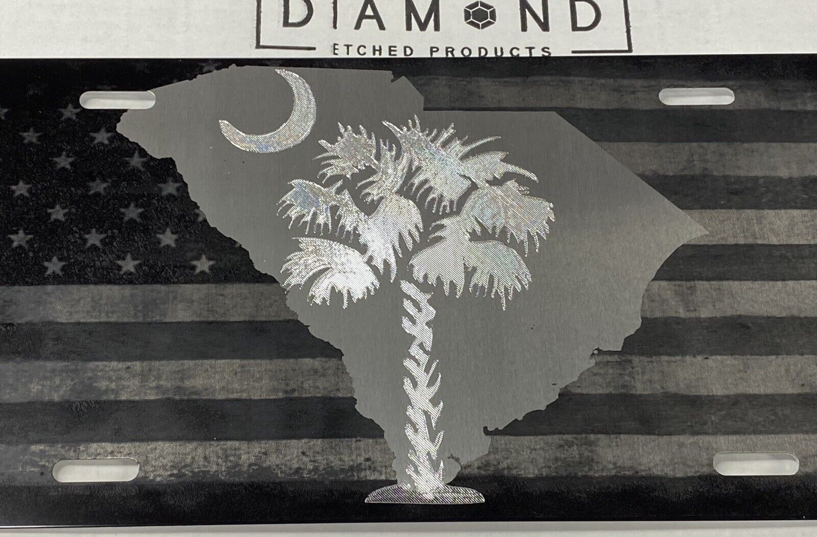 Combo Laser Engraved US Flag & Diamond Etched SC Palm Tree Car Tag License Plate
