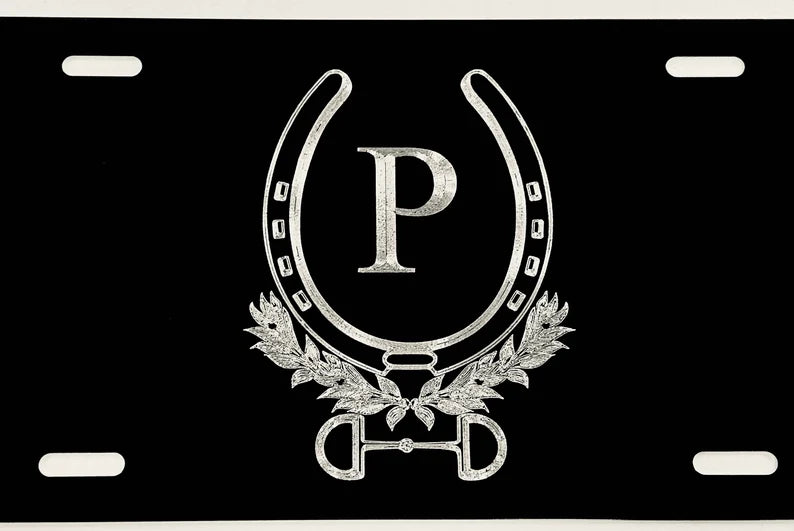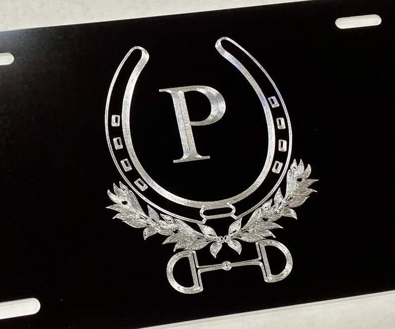 Custom Letter with Horse Shoe Diamond Etched on Aluminum License Plate, Car Tag