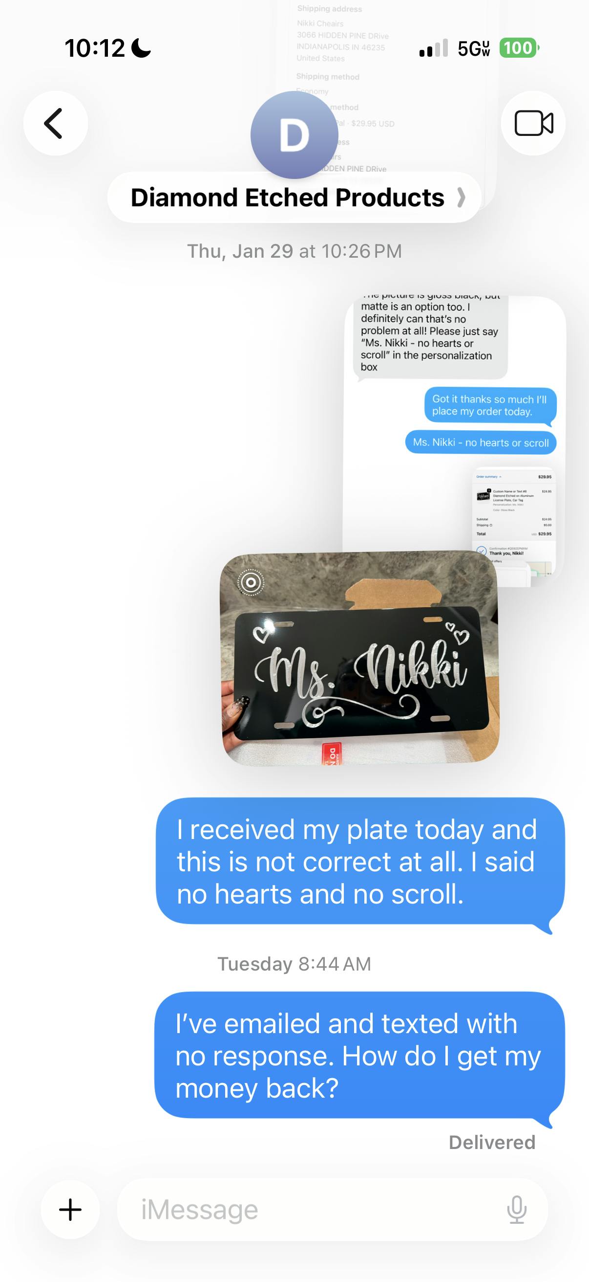 I reached out via text like the site stated on January 10th to ask if I could have the plate made with scrolls and hearts. On January 15th I received a response back. I followed the instructions and stated I did not want any scrolls or hearts on the plate. Ordered January 15th after sent yet another text to confirm exactly how I wanted i and screenshots of the order and no scrolls no hearts.. Received the plate January 29th and it was wrong. I have texted, emailed and called repeatedly no one has contacted me back nor replied at all. I am very, very, very dissatisfied and I want the product as I requested or my money back in its entirety.