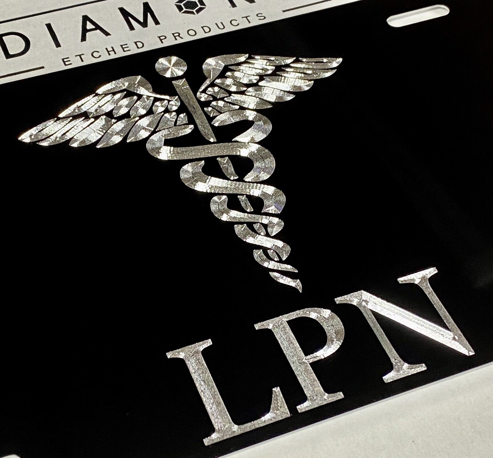 Engraved LPN Nurse Caduceus Car Tag Diamond Etched Black Metal License Plate