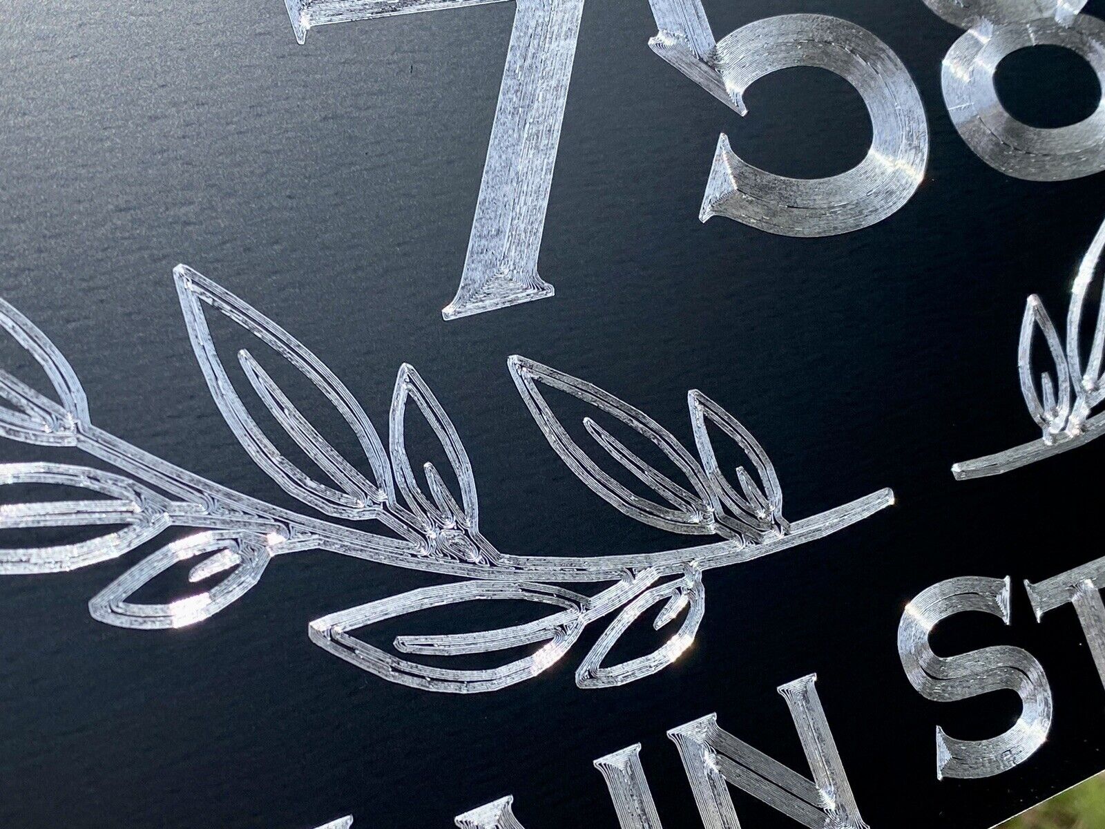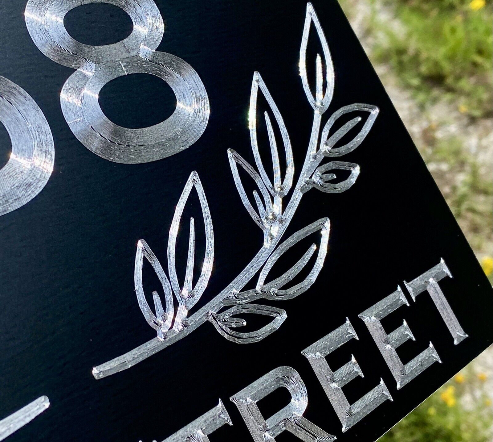 Our Diamond Etched aluminum gives a brilliant contrast to the matte black paint that cannot be fully appreciated until you see it in person. What we do for signage is what Rolls Royce does for the Automobile. Our products invoke Joy.