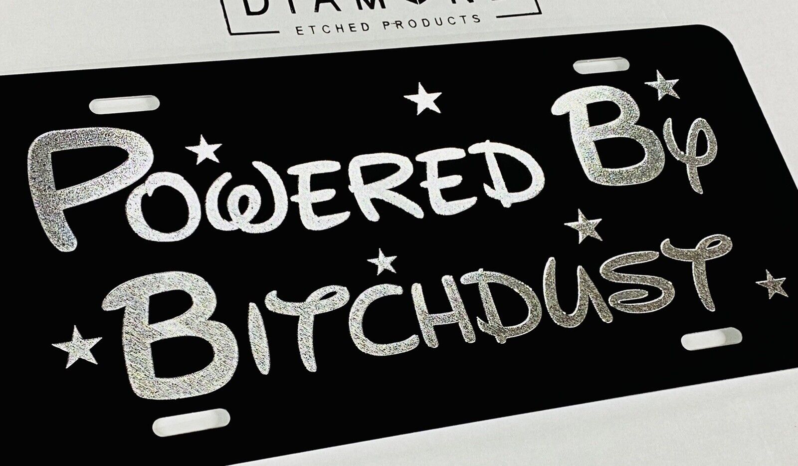 Engraved Powered By Bitch Dust Car Tag Diamond Etched Vanity License Plate Gift
