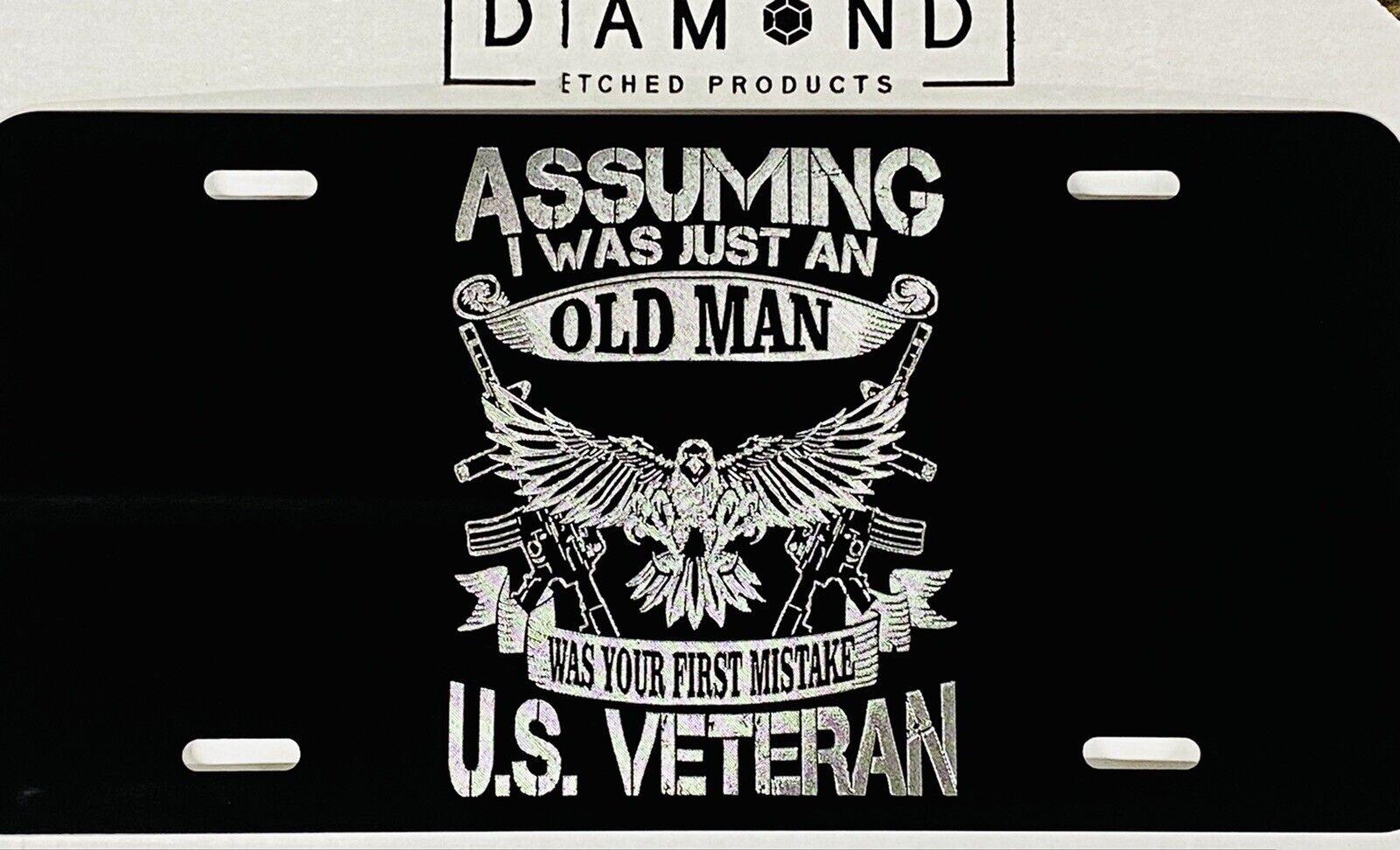 ENGRAVED US Military Old Man Veteran Car Tag Diamond Etched Metal License Plate
