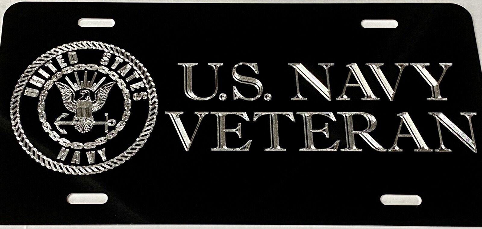 Engraved US Navy USN Veteran Car Tag Diamond Etched Black Metal License Plate
