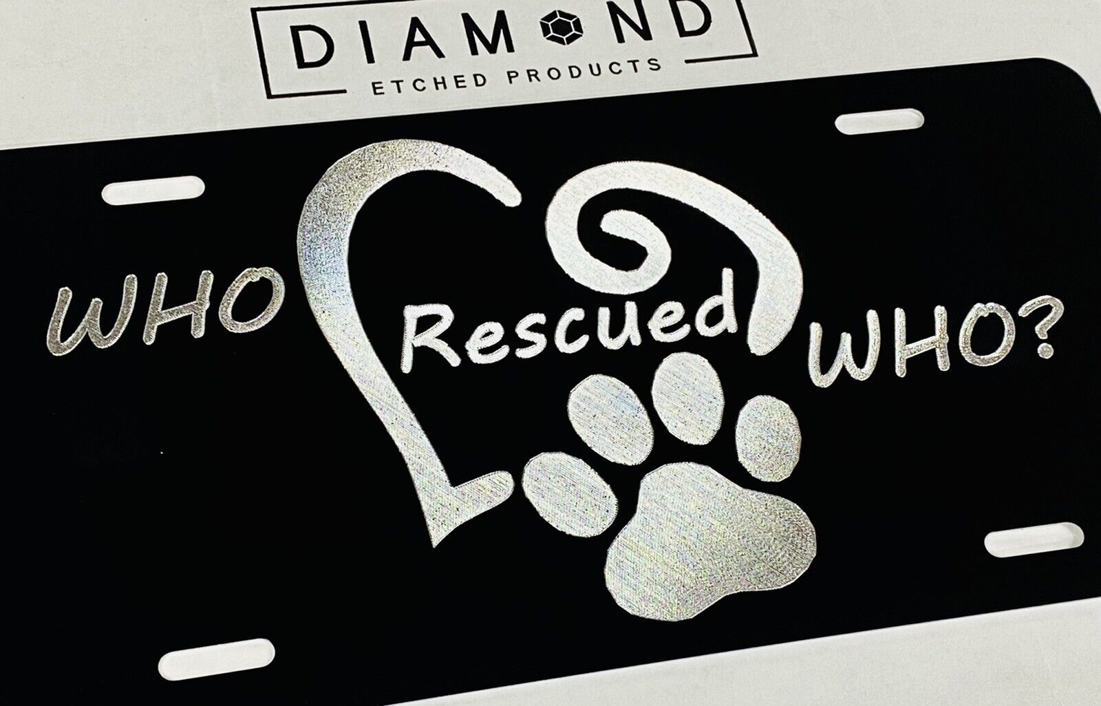 Engraved Who Rescued Who Dog Pet Adoption Diamond Etched License Plate Car Tag