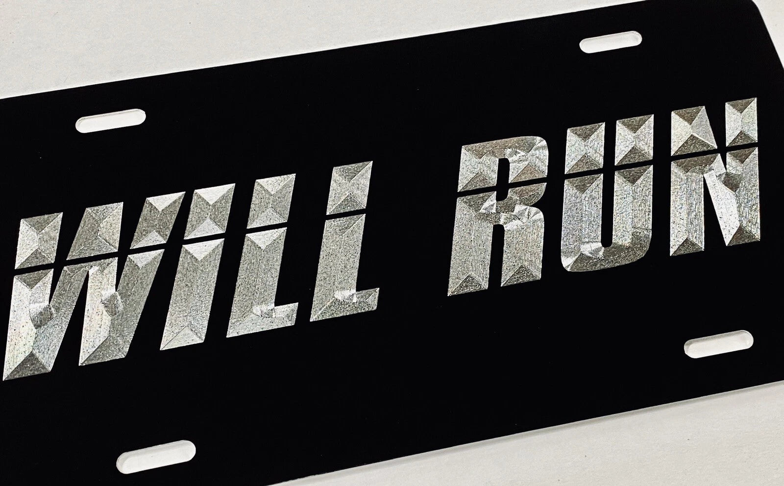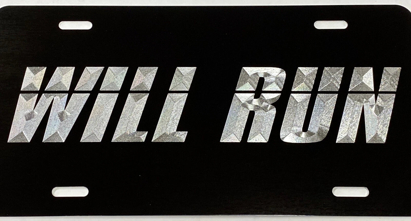 Engraved WILL RUN Diamond Etched Aluminum Metal Black License Plate Car Tag