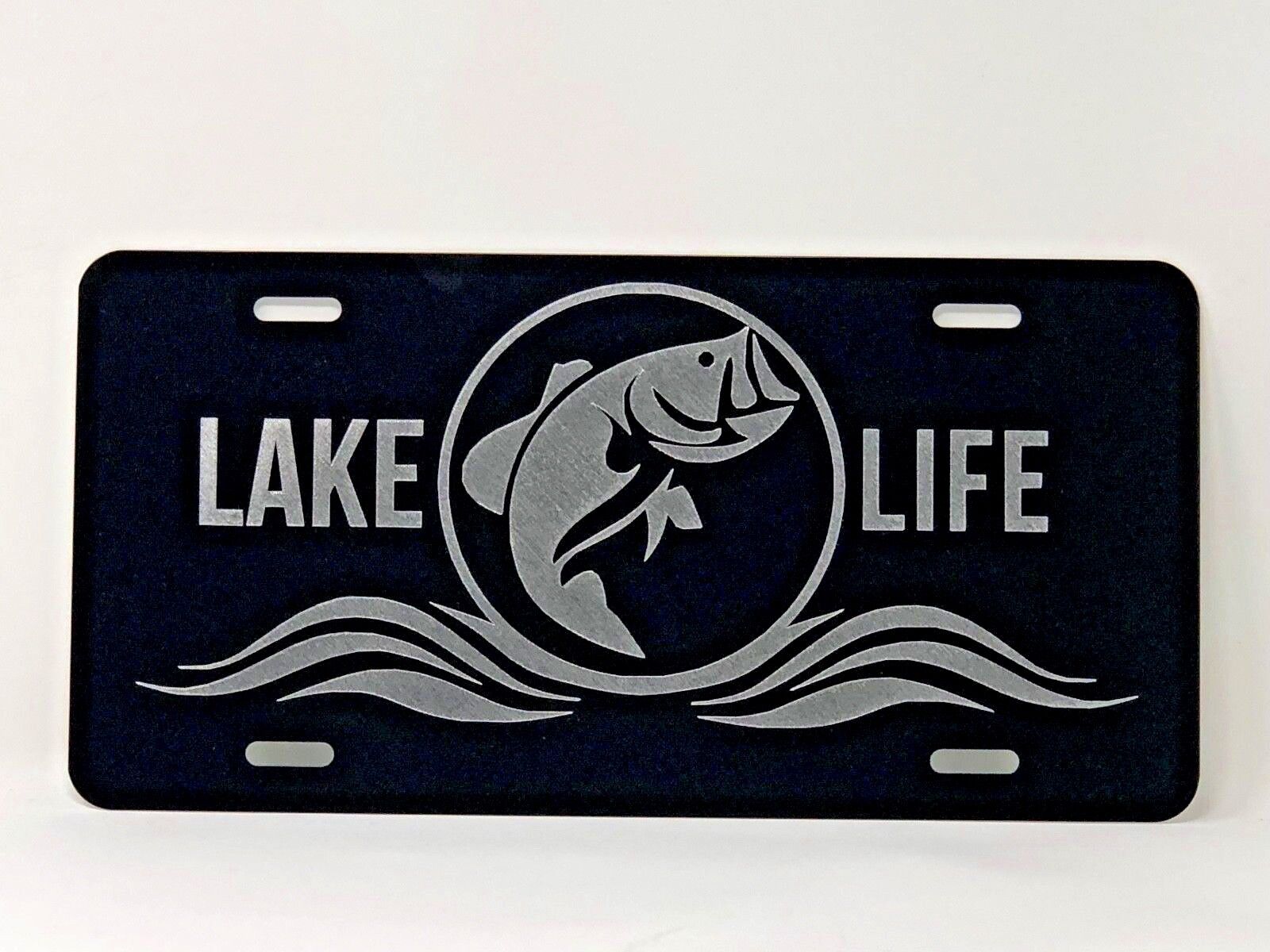 Lake Life logo Car Tag Diamond Etched on Black Aluminum License Plate