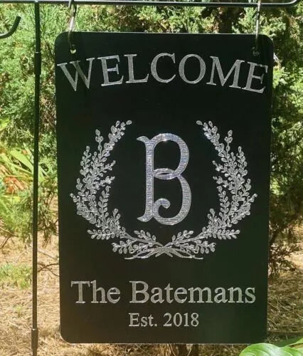 12"x18" garden flag made from matte black .040 aluminum. Diamond etched to personalize to your liking.