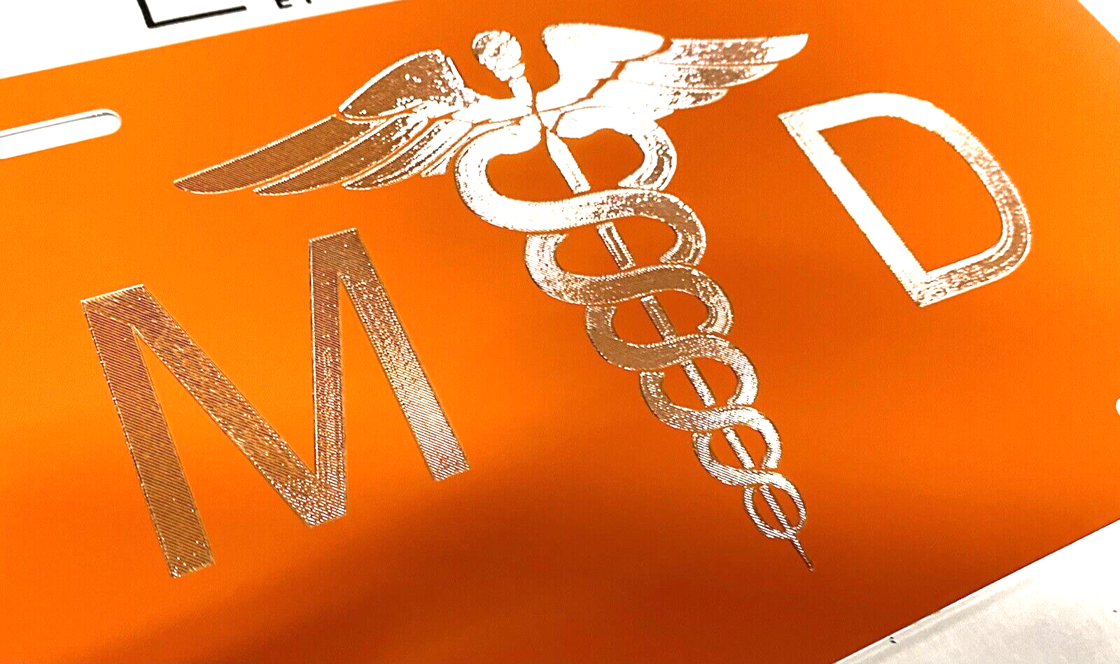 Silver Engraved MD Medical Doctor Caduceus Car Tag Diamond Etched License Plate
