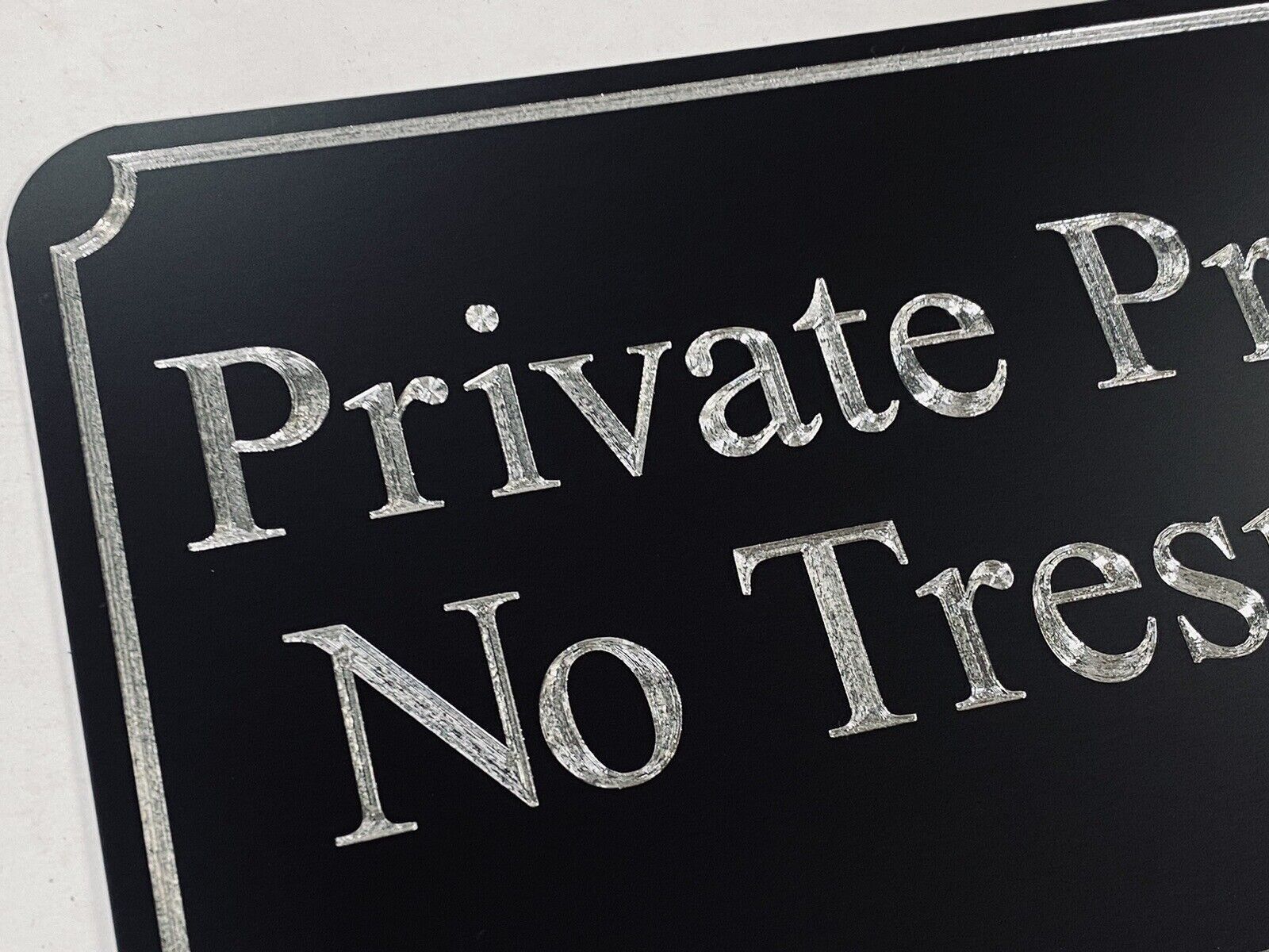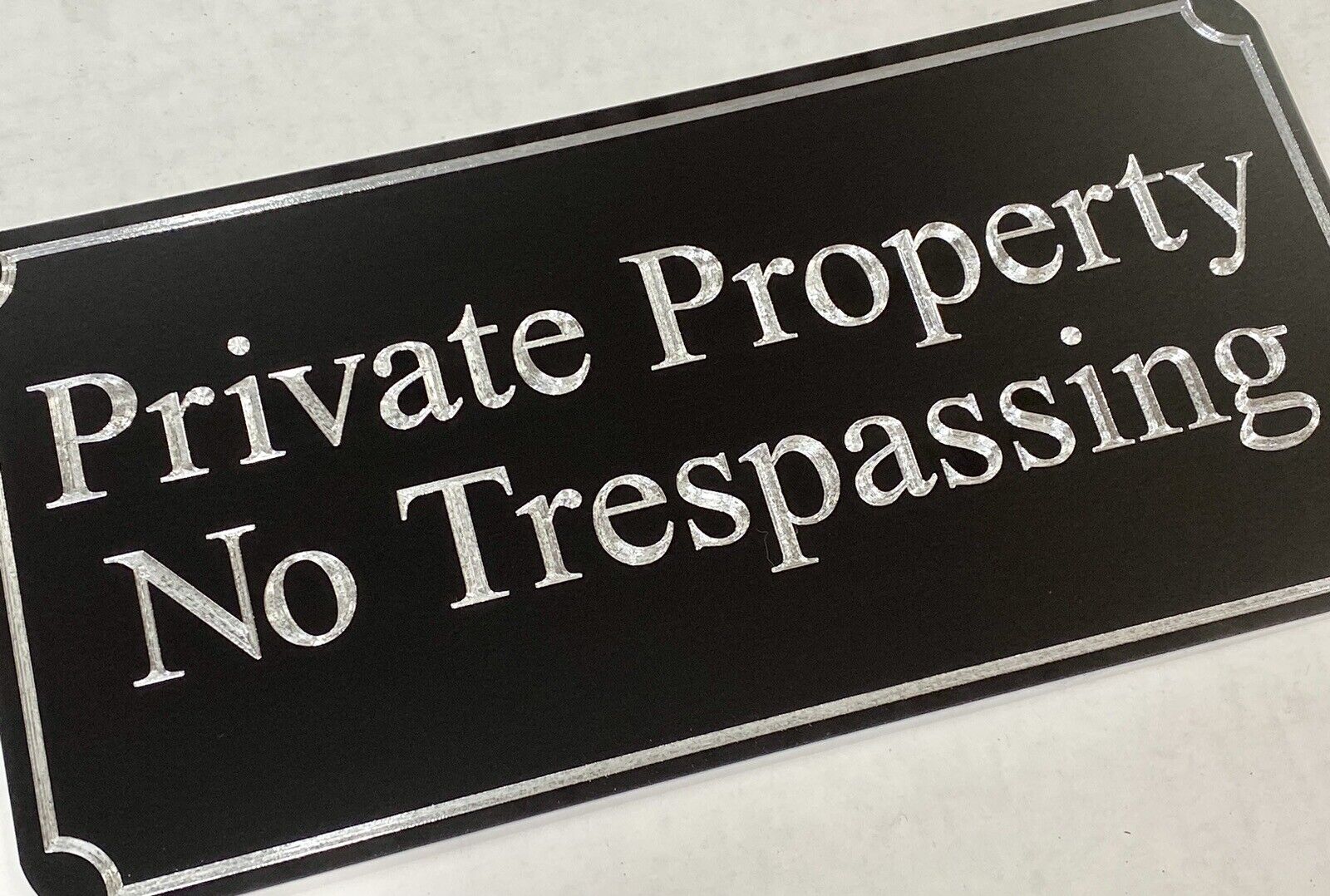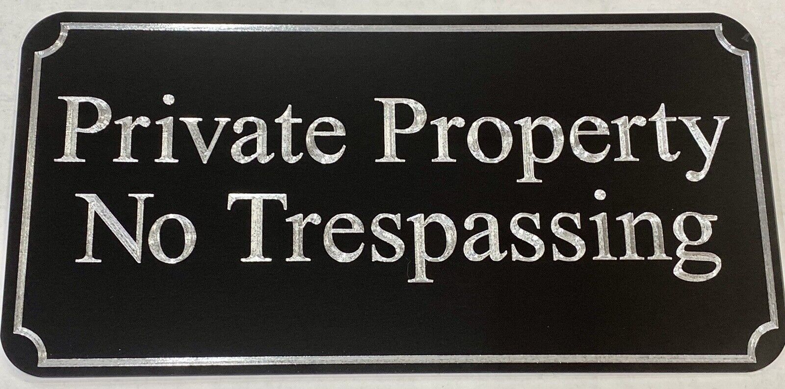 Silver Engraved Private Property No Trespassing Black Sturdy Metal 12x6 Sign