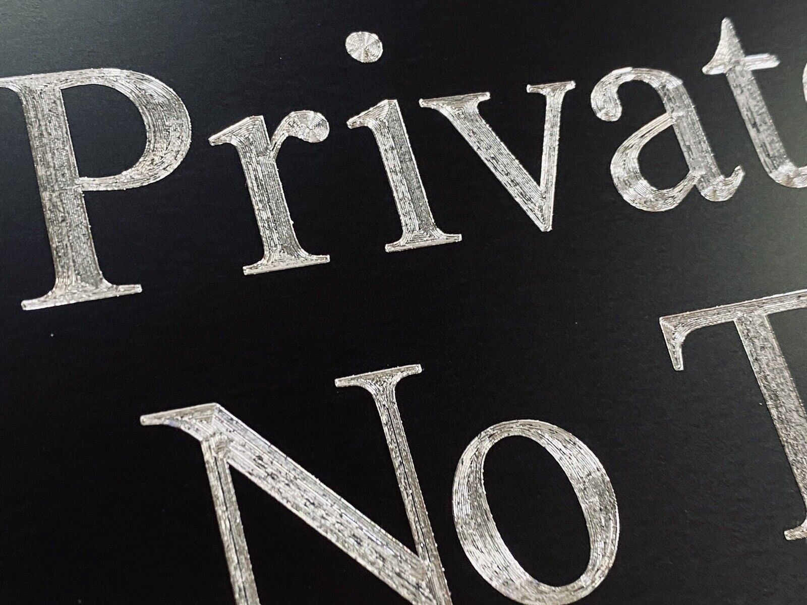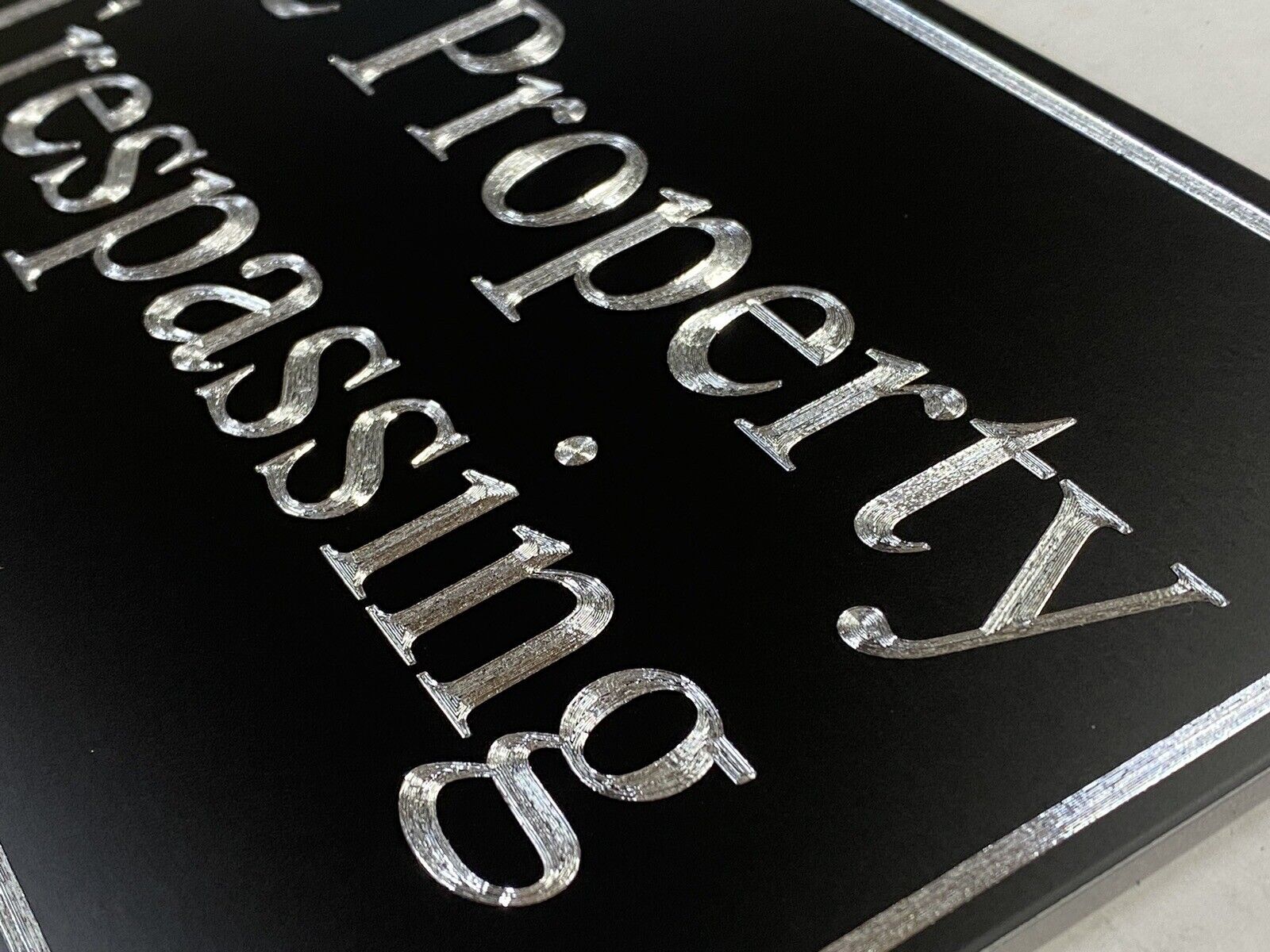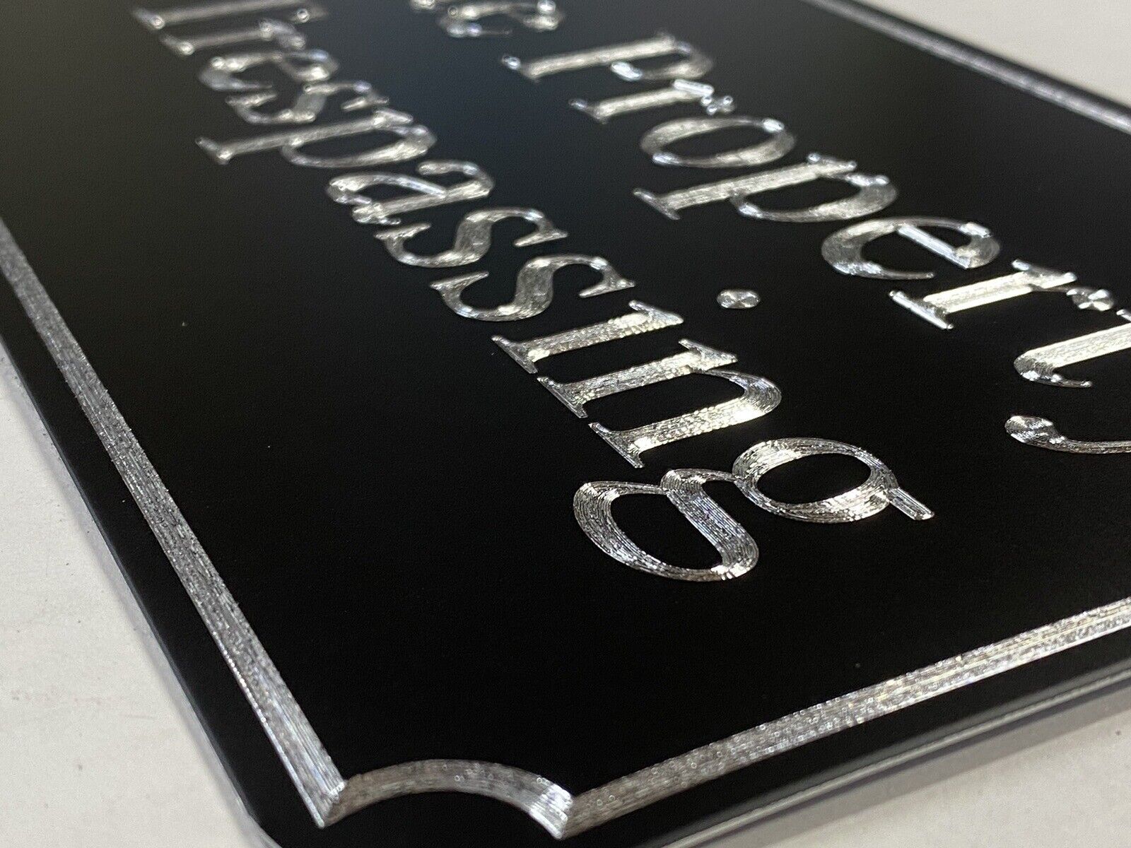 Silver Engraved Private Property No Trespassing Black Sturdy Metal 12x6 Sign