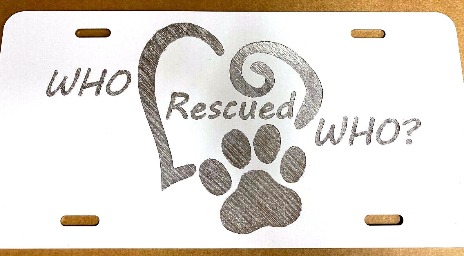 Who Rescued Who? Pet Adoption Diamond Etched Engraved Wht License Plate Tag Gift